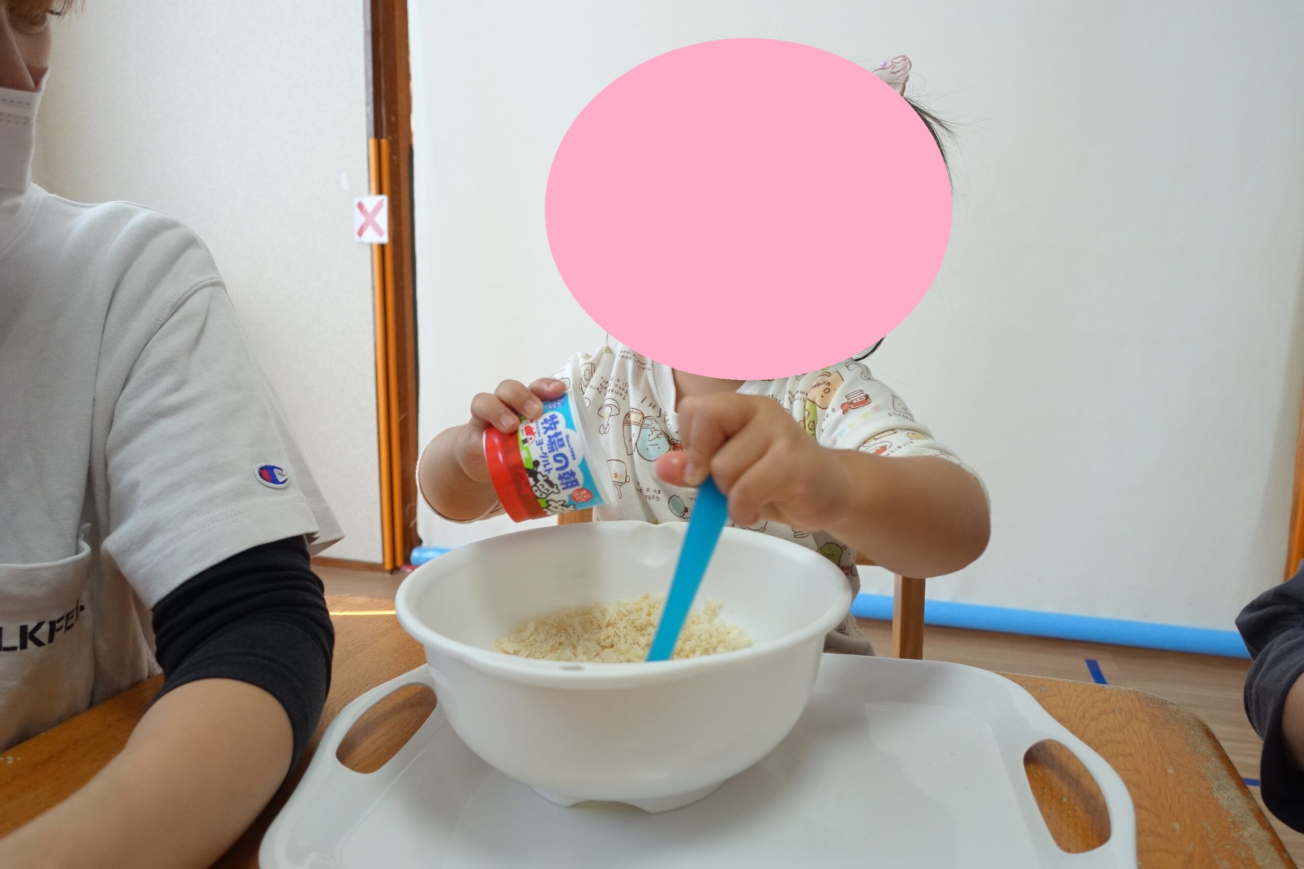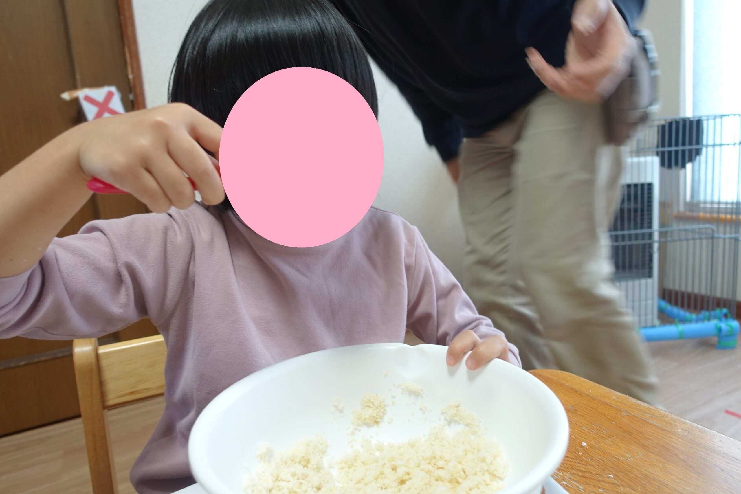 中には「これはごはん〜!」「ケーキできた!」「パン屋さんです〜!」と、パン粉を食べものに見立てて遊ぶ姿も✨