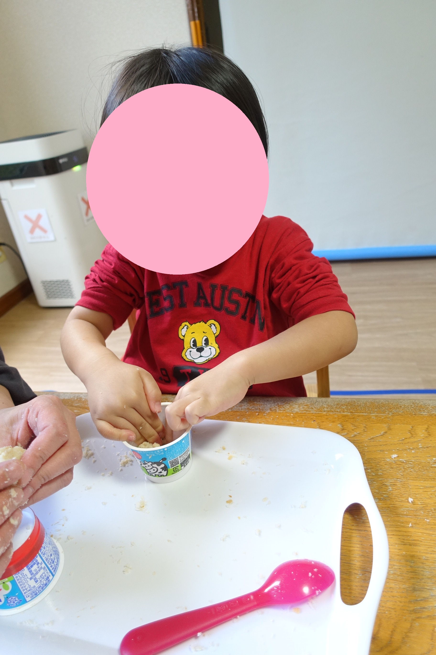 カップやスプーンを使ってすくったり、型に入れて形を作ったりと、思い思いに遊びを広げていきました🍰