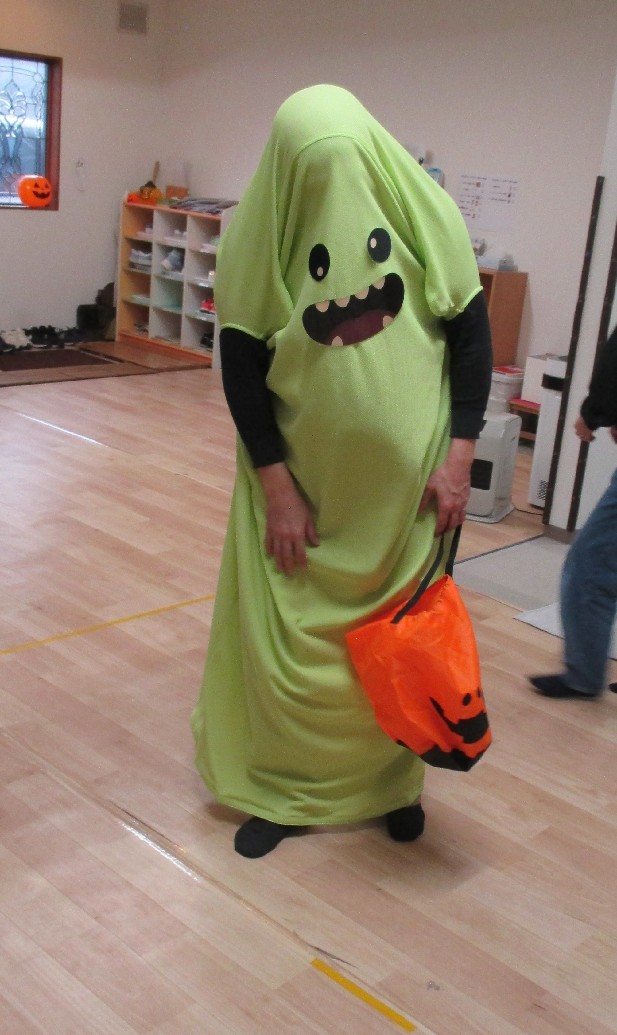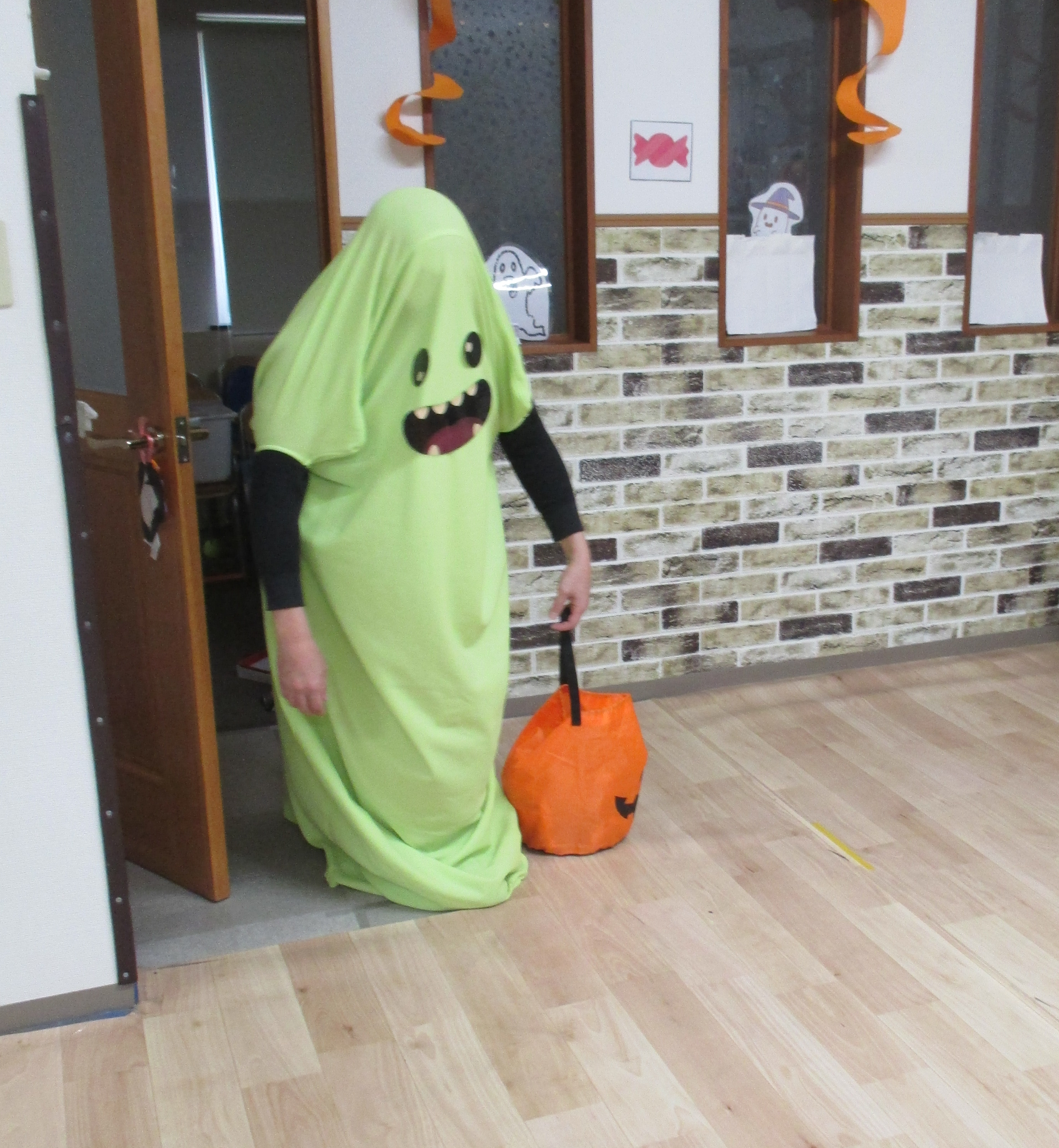 グリーンモンスターが登場💚🍬 ちょっぴり怖がる子もいましたが、お菓子をもらうとにっこり☺️
