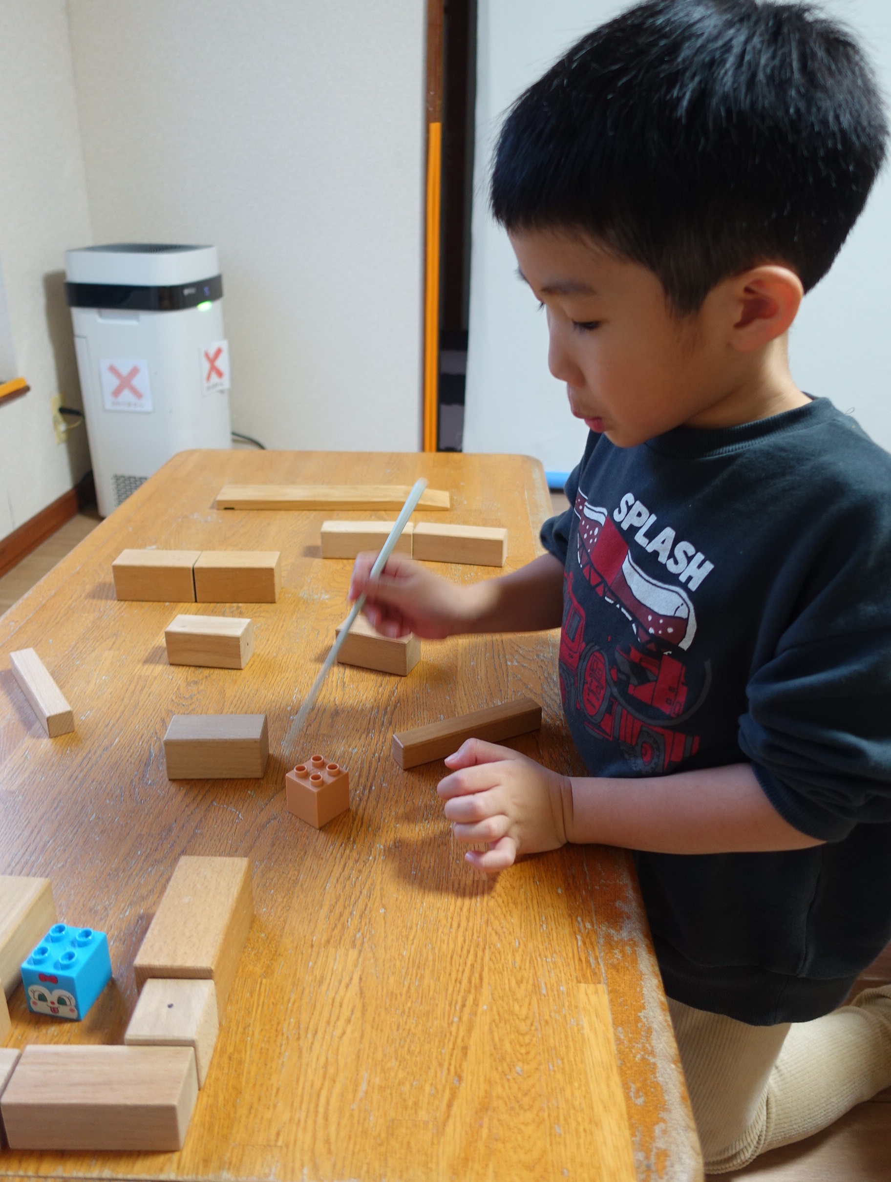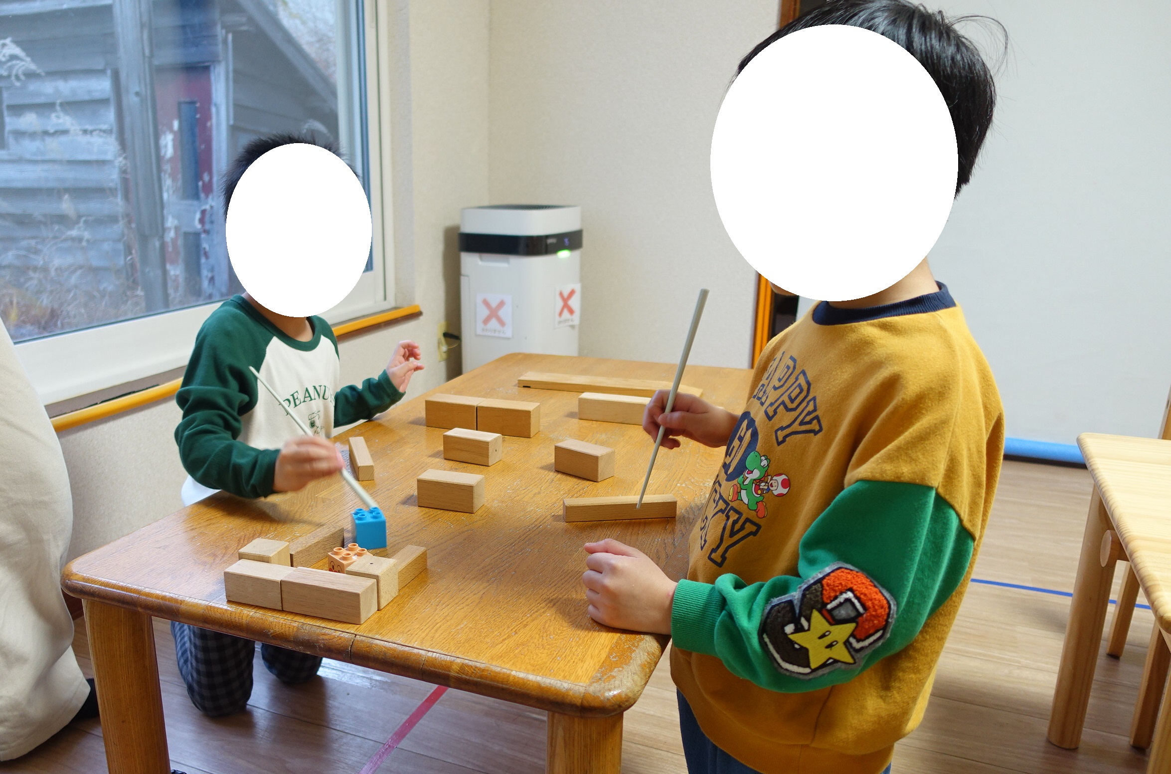 机の上に積み木で迷路をセットし、子どもたちは道からはみ出さないように気をつけながら、お箸で小さなブロックをツンツンと押してゴールまで運びます🎯
