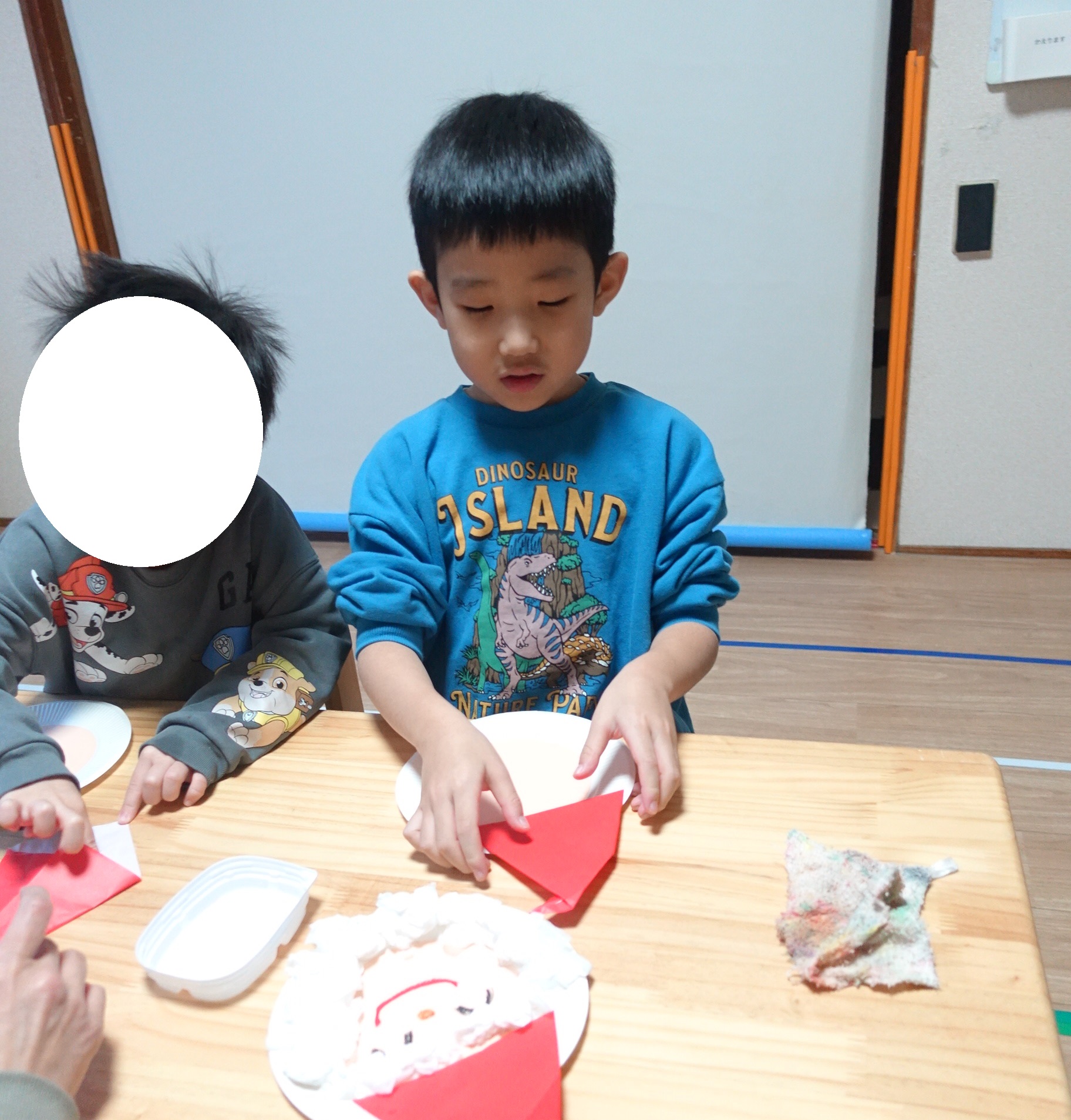 らいおんくらすは、まず折り紙でサンタさんの帽子作りからスタート!