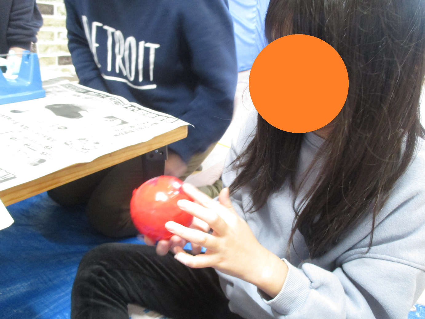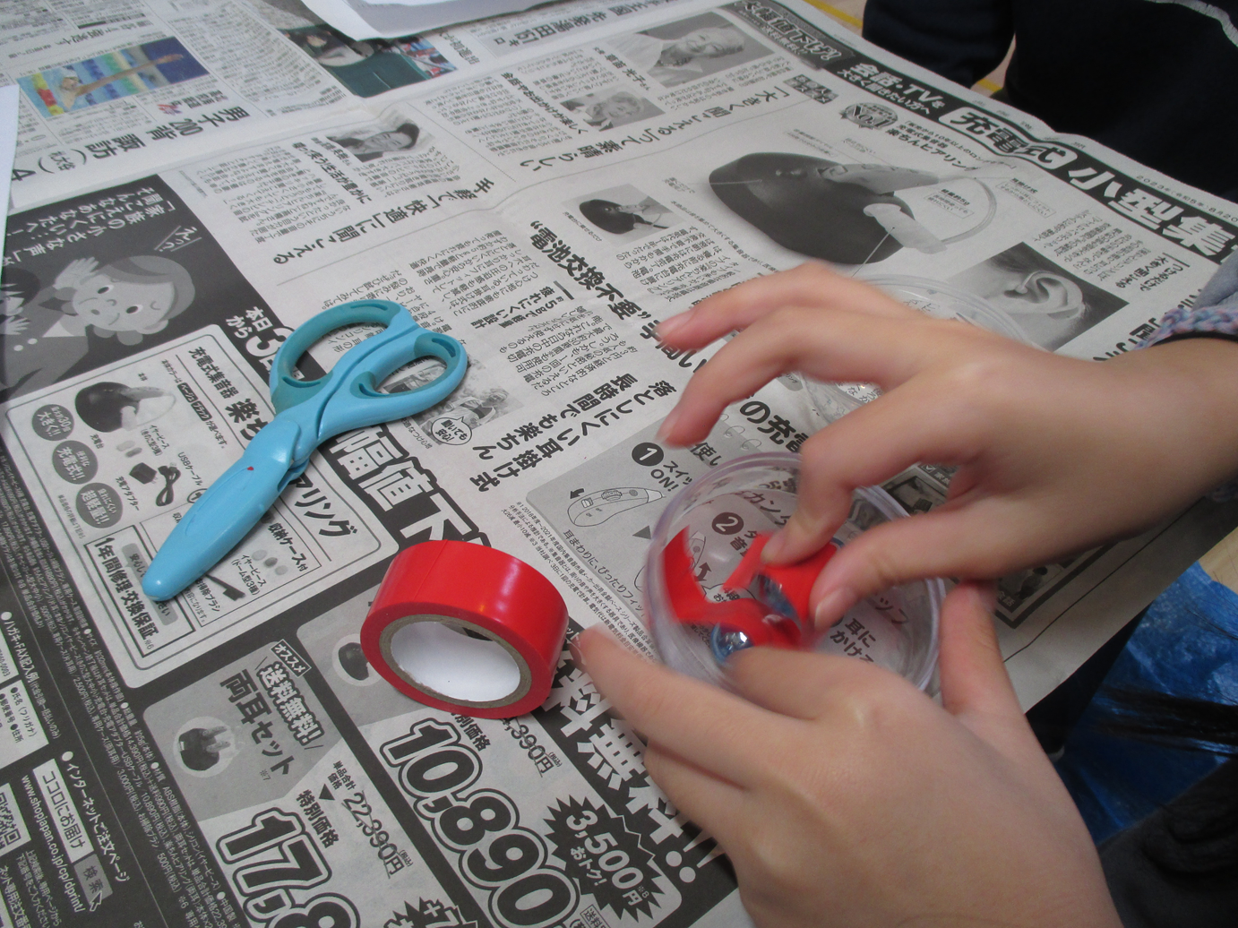 ガチャガチャのカプセルにビー玉を入れて重りを作り、赤いビニールテープをぐるぐる巻いてサンタの体にしていきます。