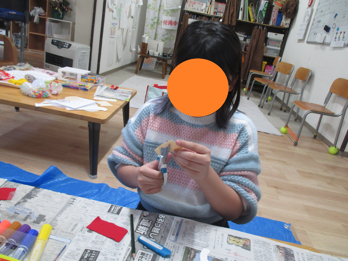 お顔は画用紙でパーツを貼り合わせ、帽子はフェルトで仕上げました🎅