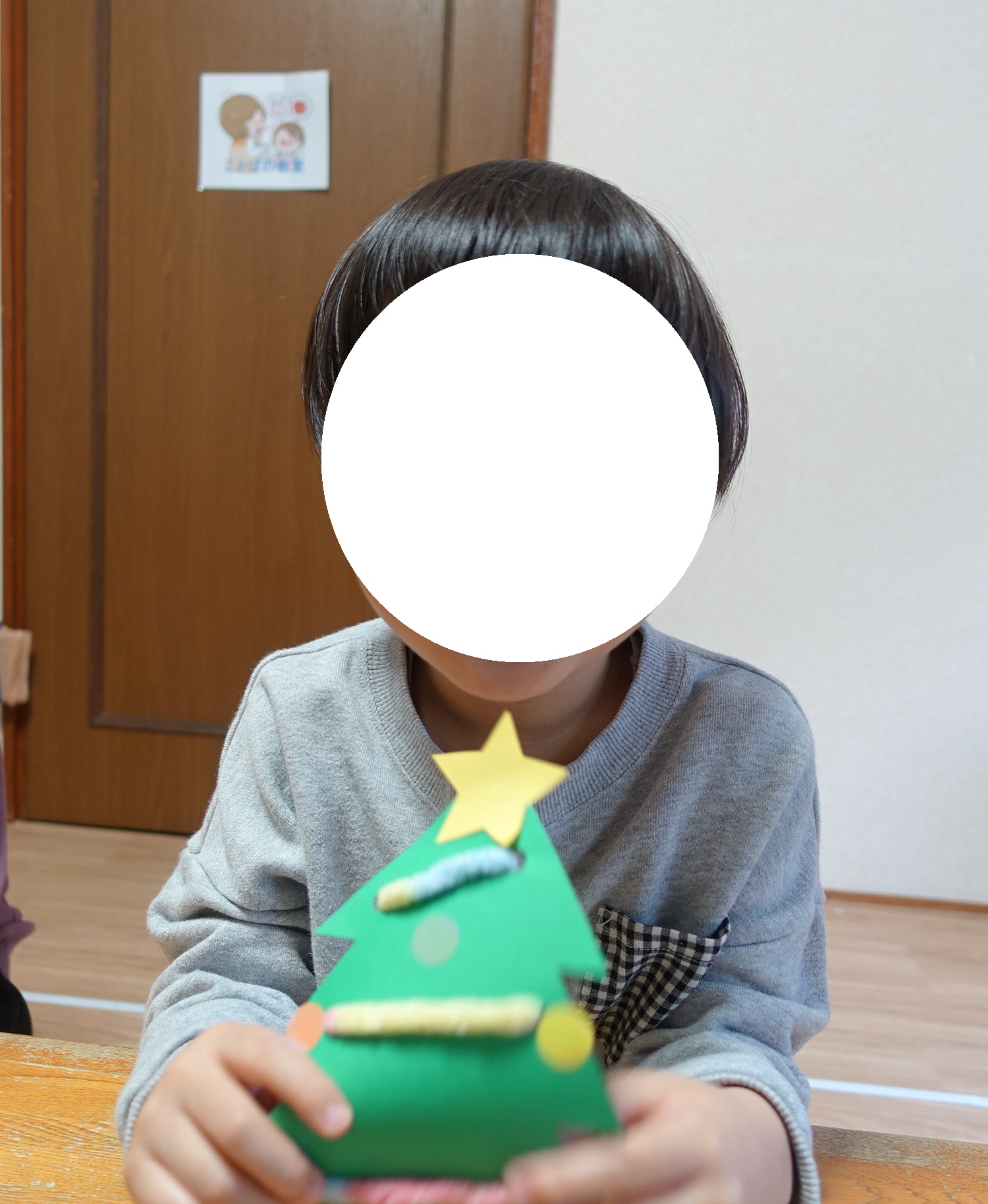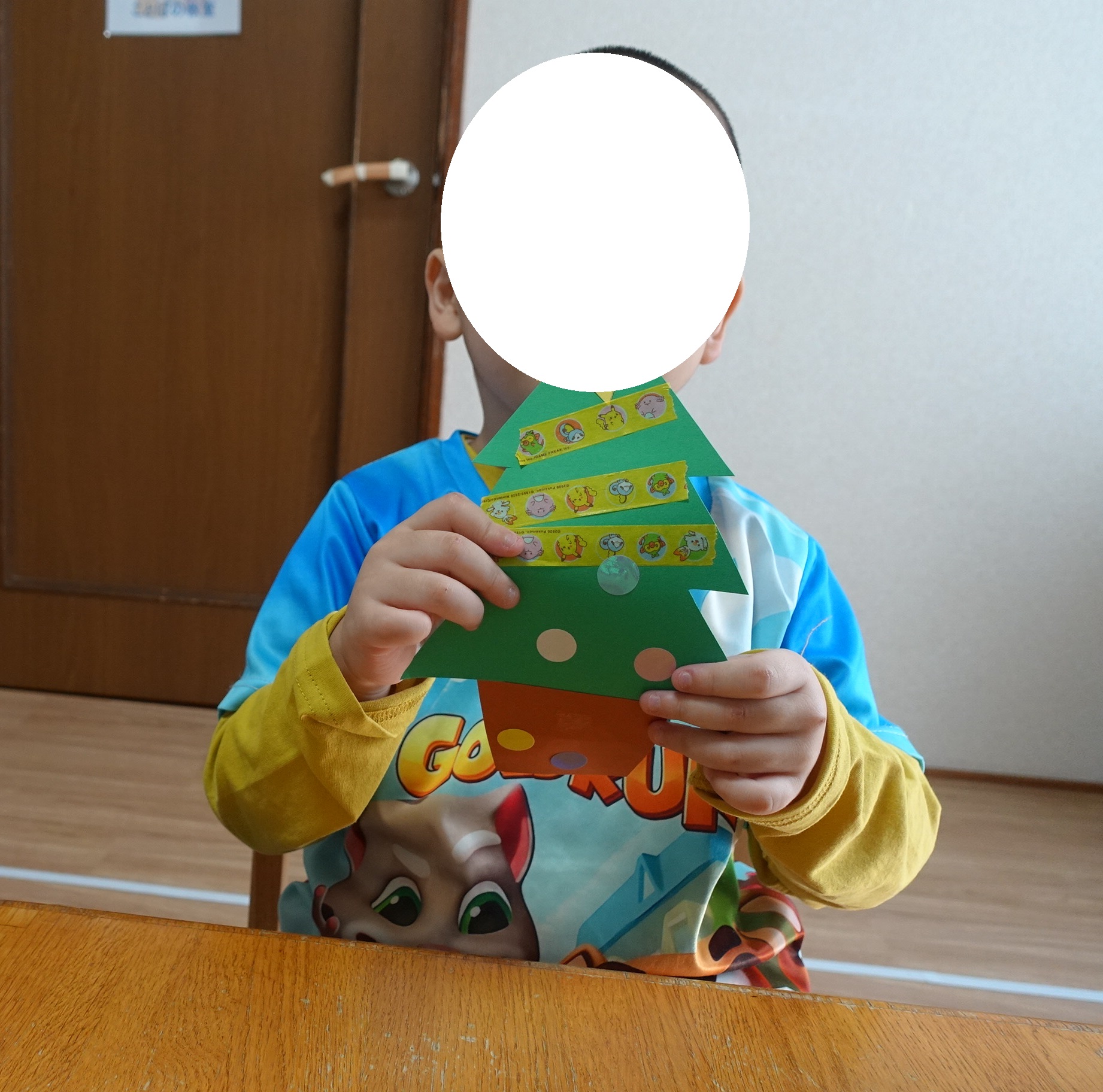毛糸を通したあとは、丸シールと星形の画用紙で飾り付けをして、素敵なツリーが完成しました✨
