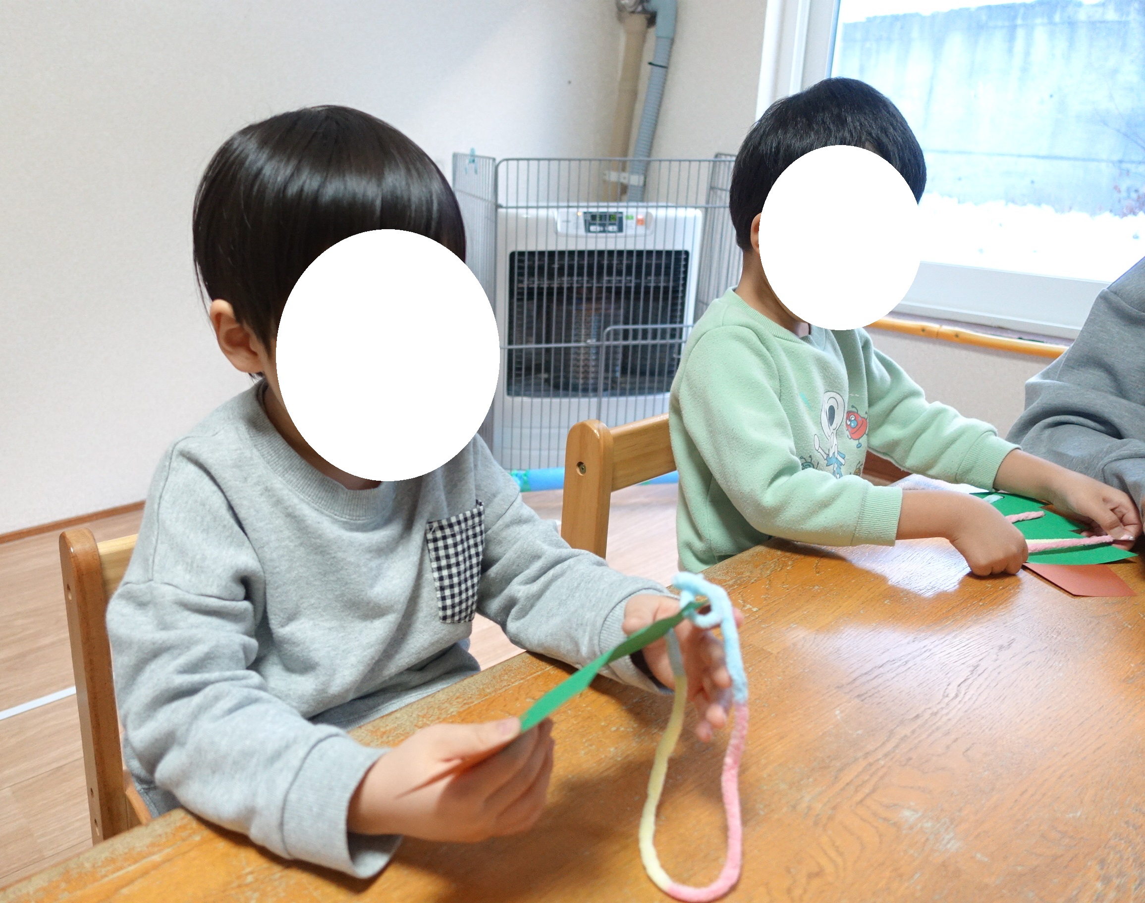 らいおんくらすでは、穴の開いたツリーに毛糸を通す製作に挑戦しました✊