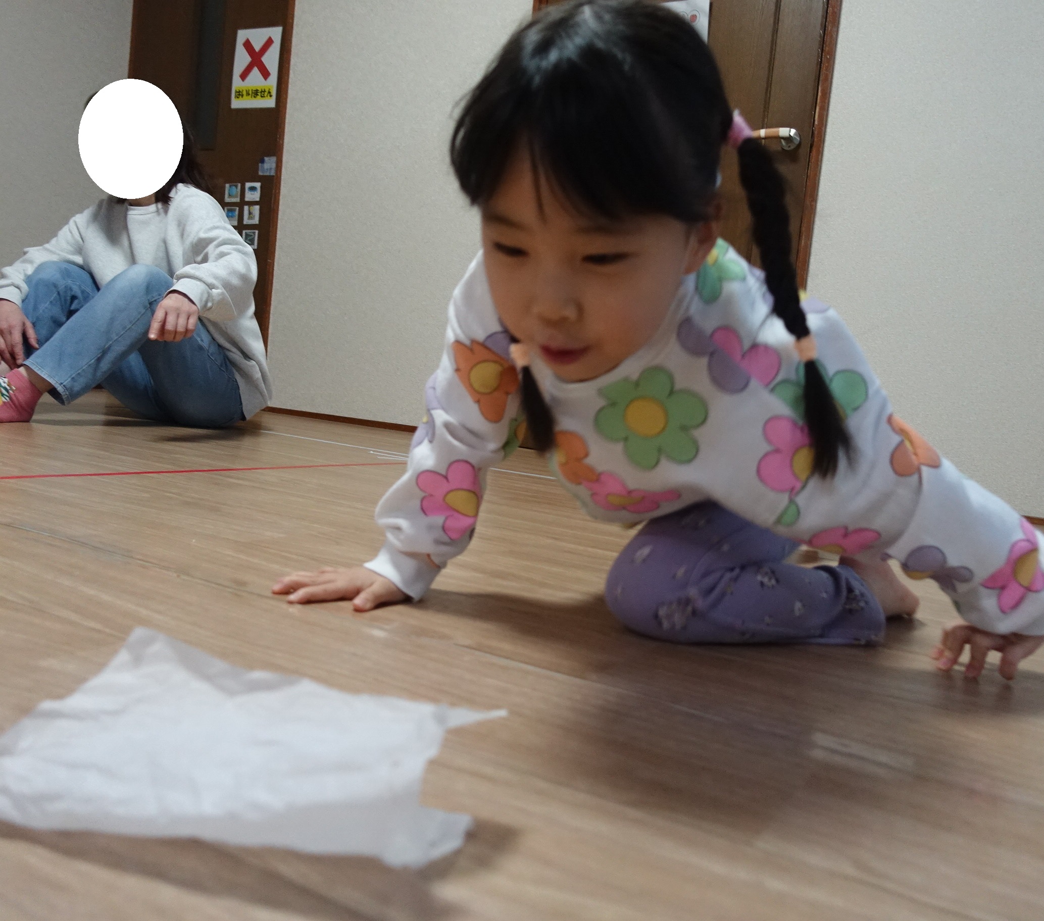 ティッシュに息を「ふーっ!」と吹きかけて、前に飛ばしながら進みました。
