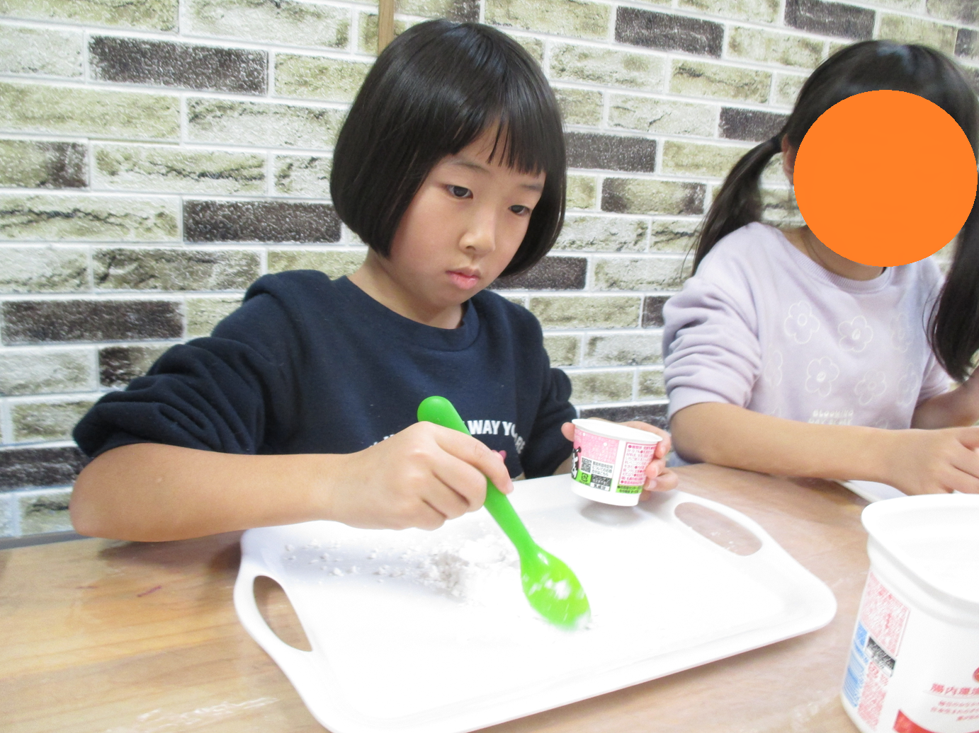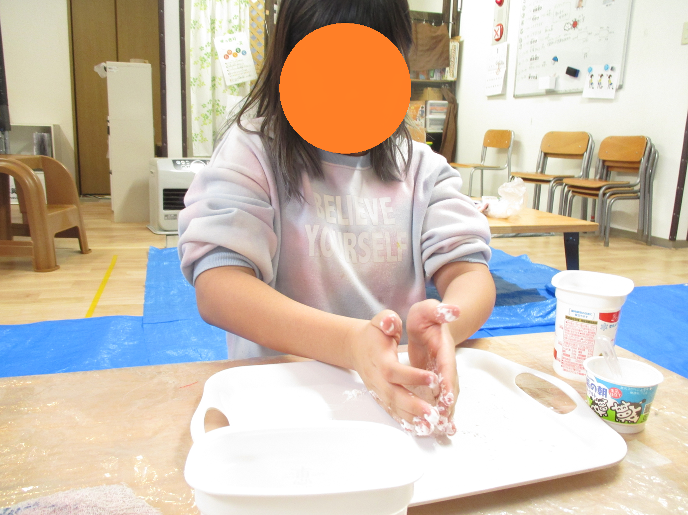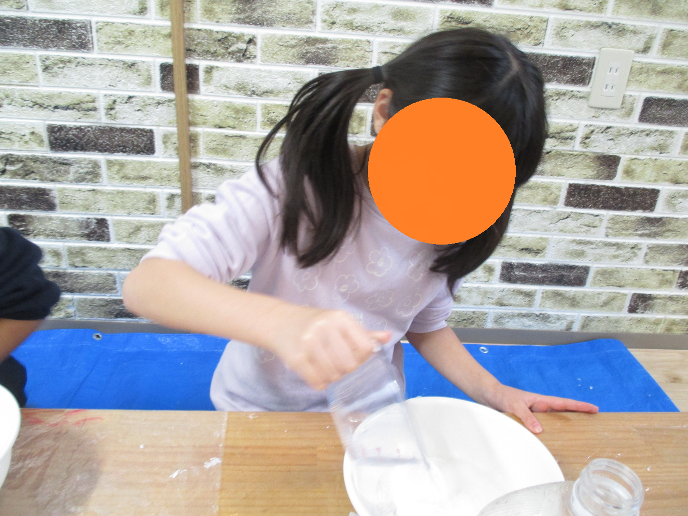 片栗粉にリンスを混ぜていくとサラサラだった片栗粉がダマになり、感触の違いを感じる子ども達😊