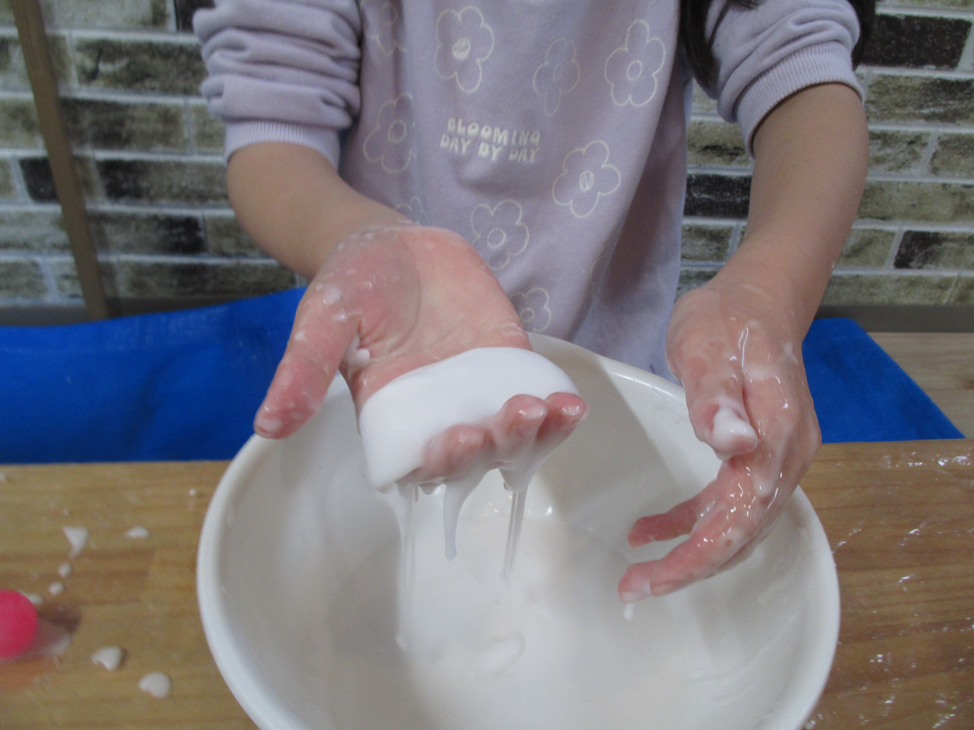 そっと触るとドロ〜っと流れるのに、ぎゅっと握るとカチッと固くなる不思議さに、みんなびっくり😲