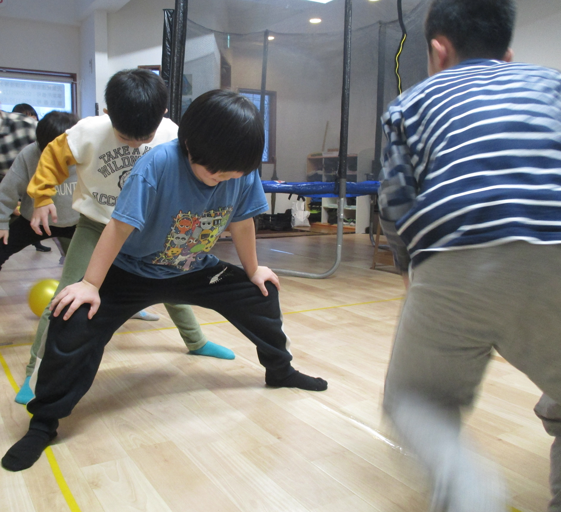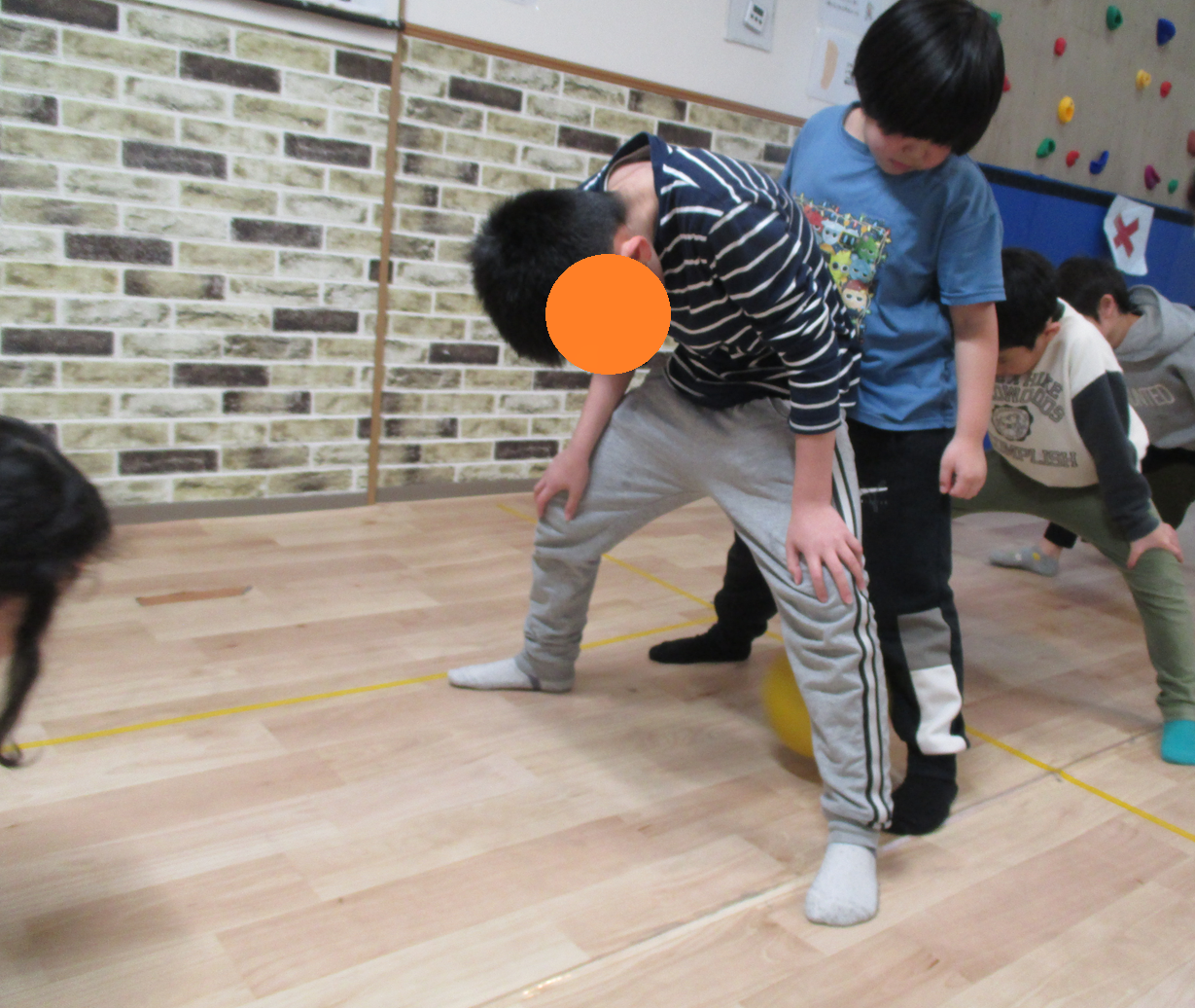 みんなで1列に並び、足を開いてトンネルを作り!前から転がってくるボールを足の間に通していく遊びです♪