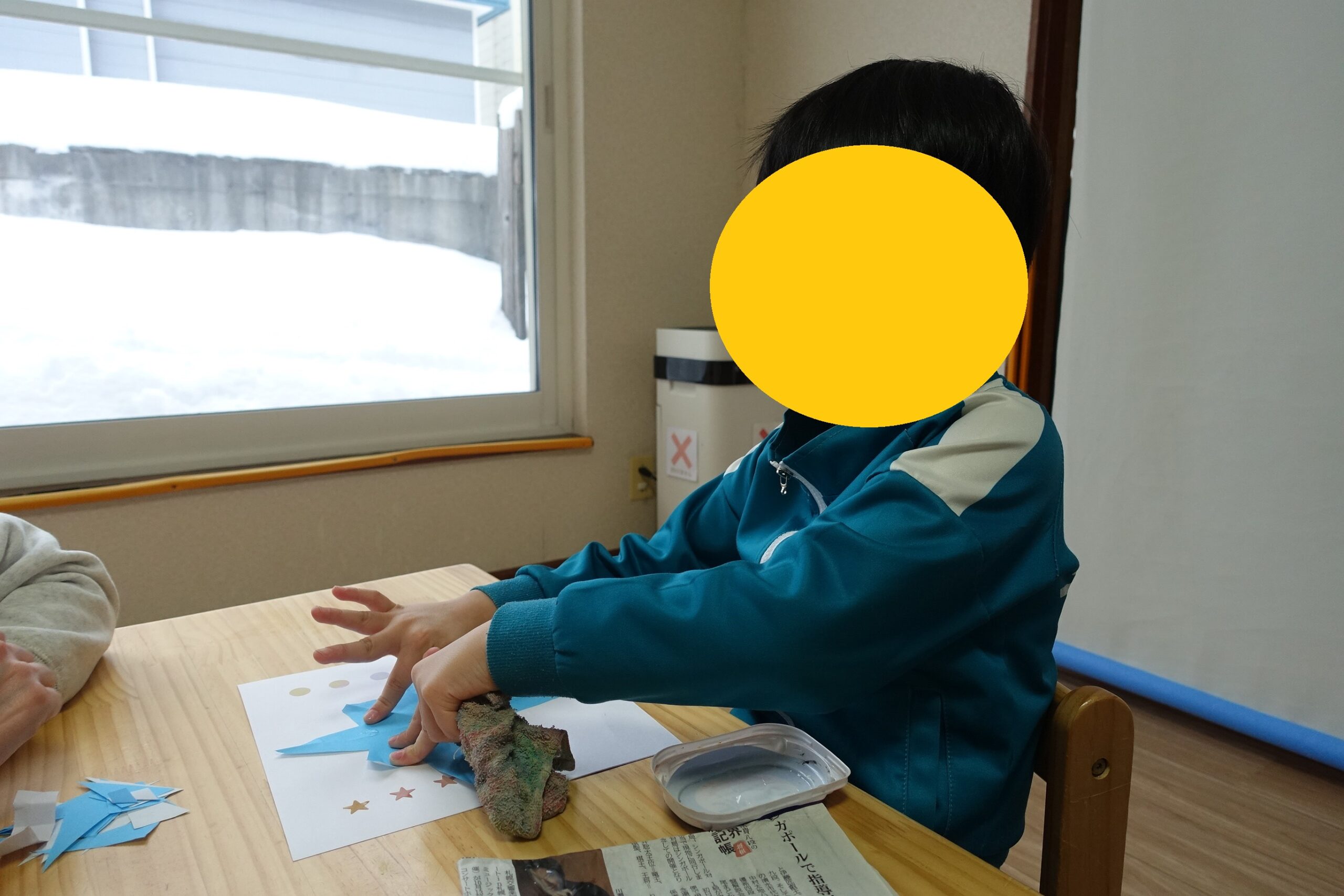 指先でつまんで貼る動きを通して、手指の力や集中力を育てています✋
