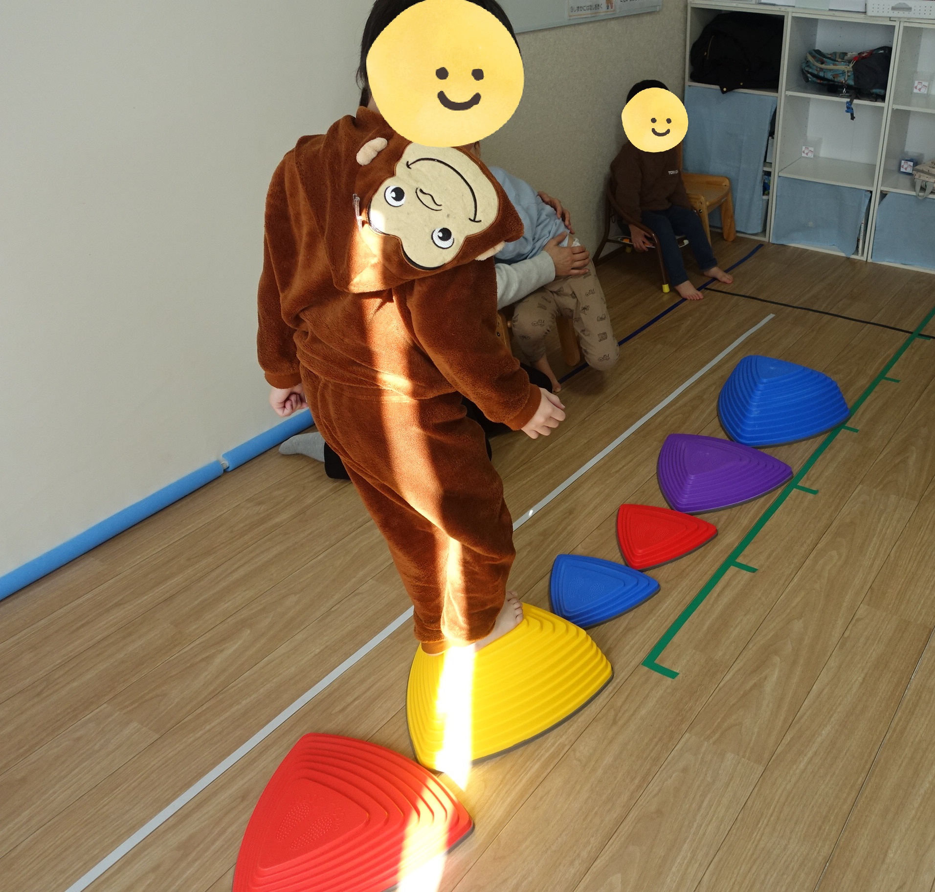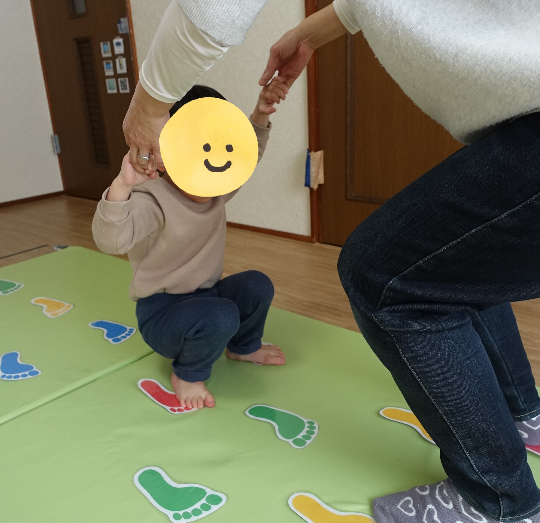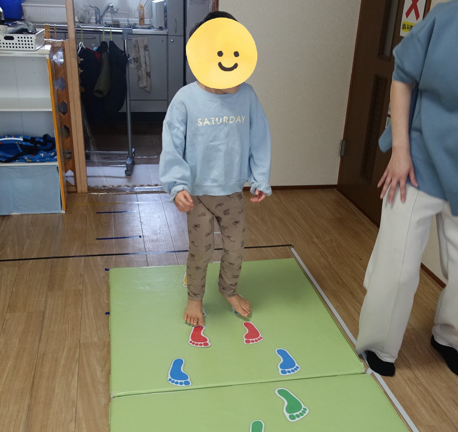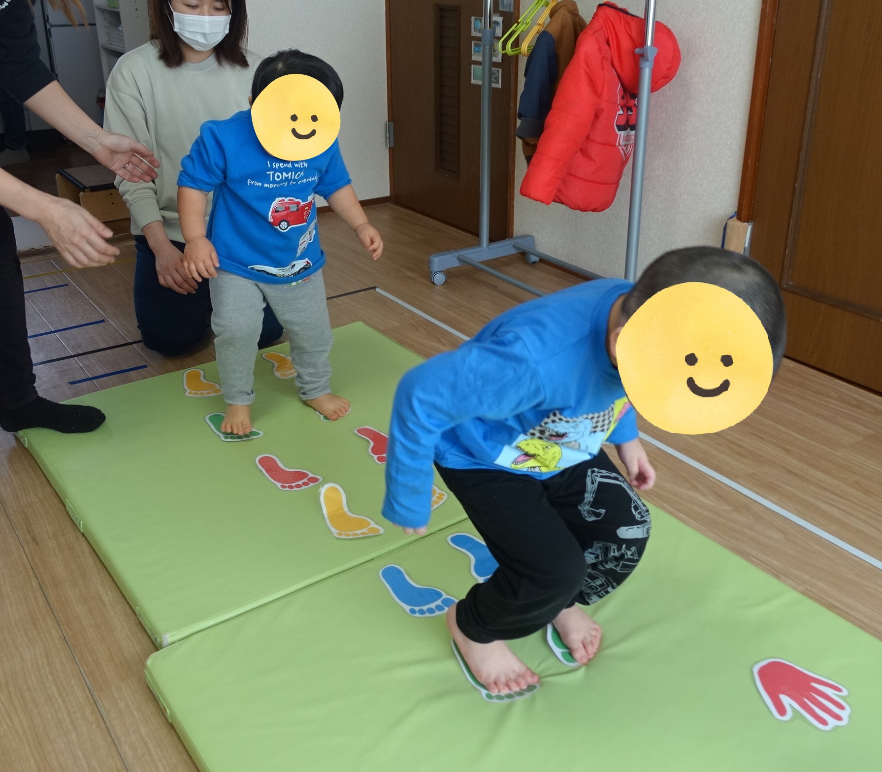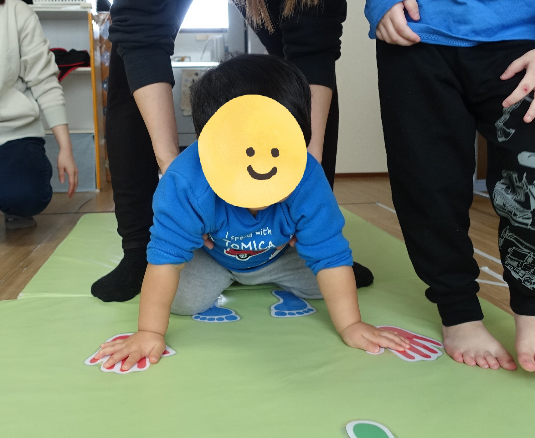 まずはマットに貼った手形と足形に合わせて進みます😊