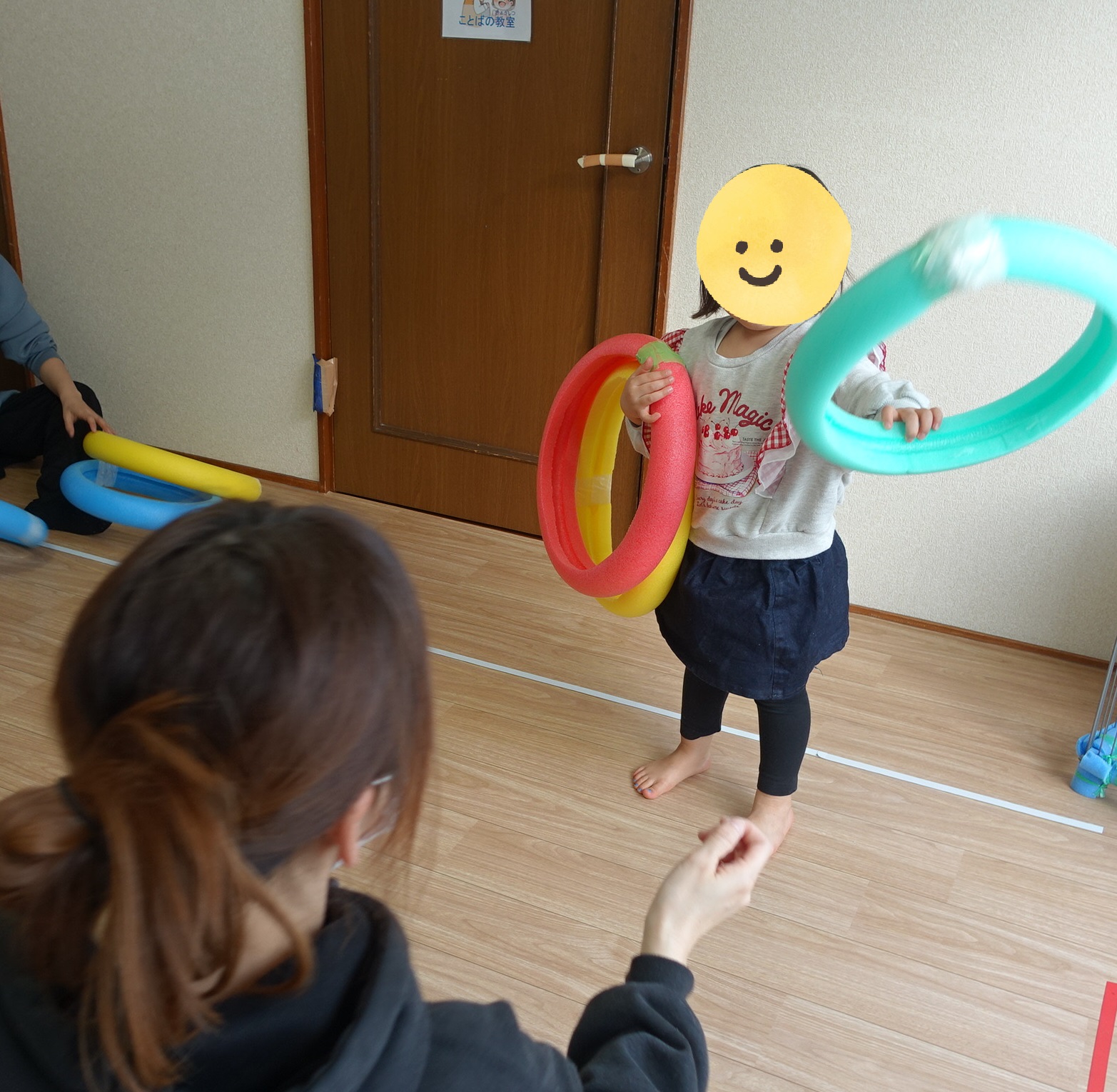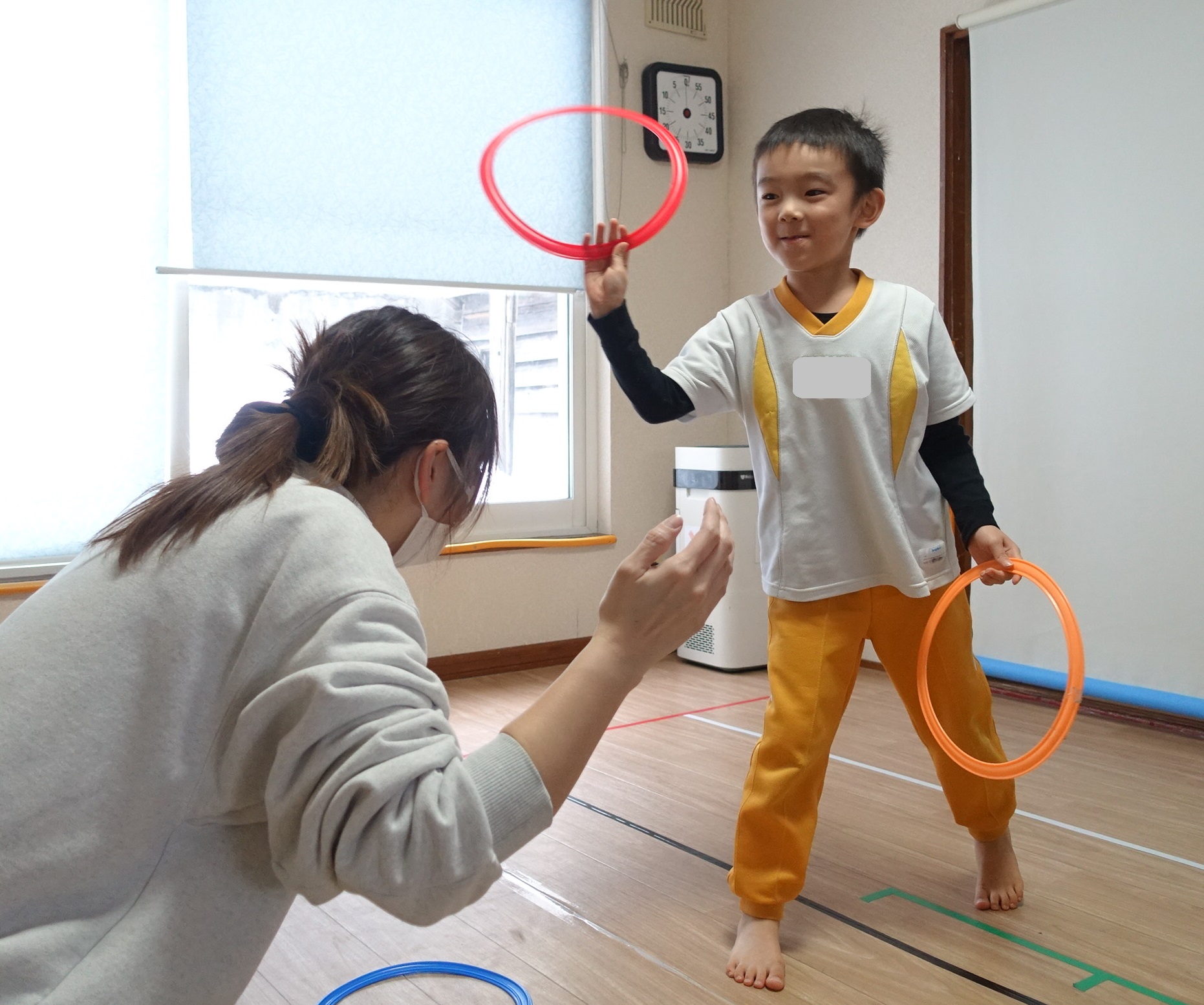 まずはウォーミングアップとして、先生の手をめがけてフープを「えいっ!」と投げることからスタート‼️