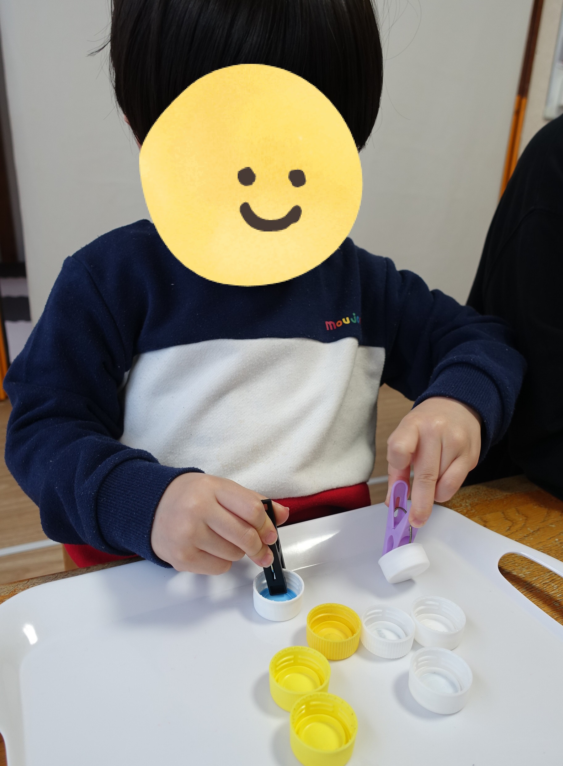 1つ目のゲームは、利き手で洗濯ばさみを持ち、ペットボトルのキャップを挟んで運ぶ活動!