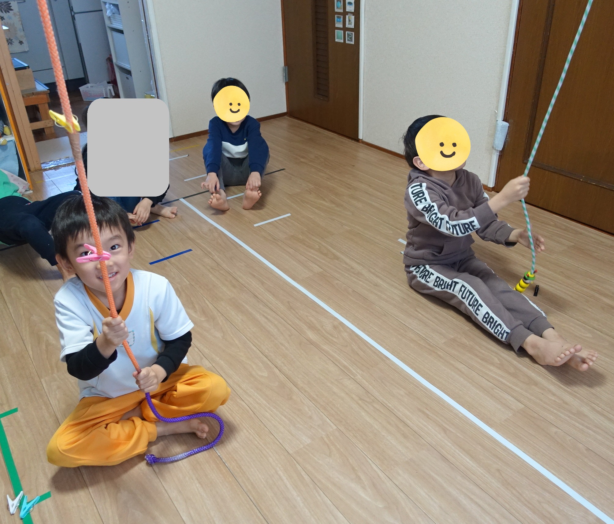 重りをつけたひもを手繰り寄せながら、洗濯ばさみが来たら取る!