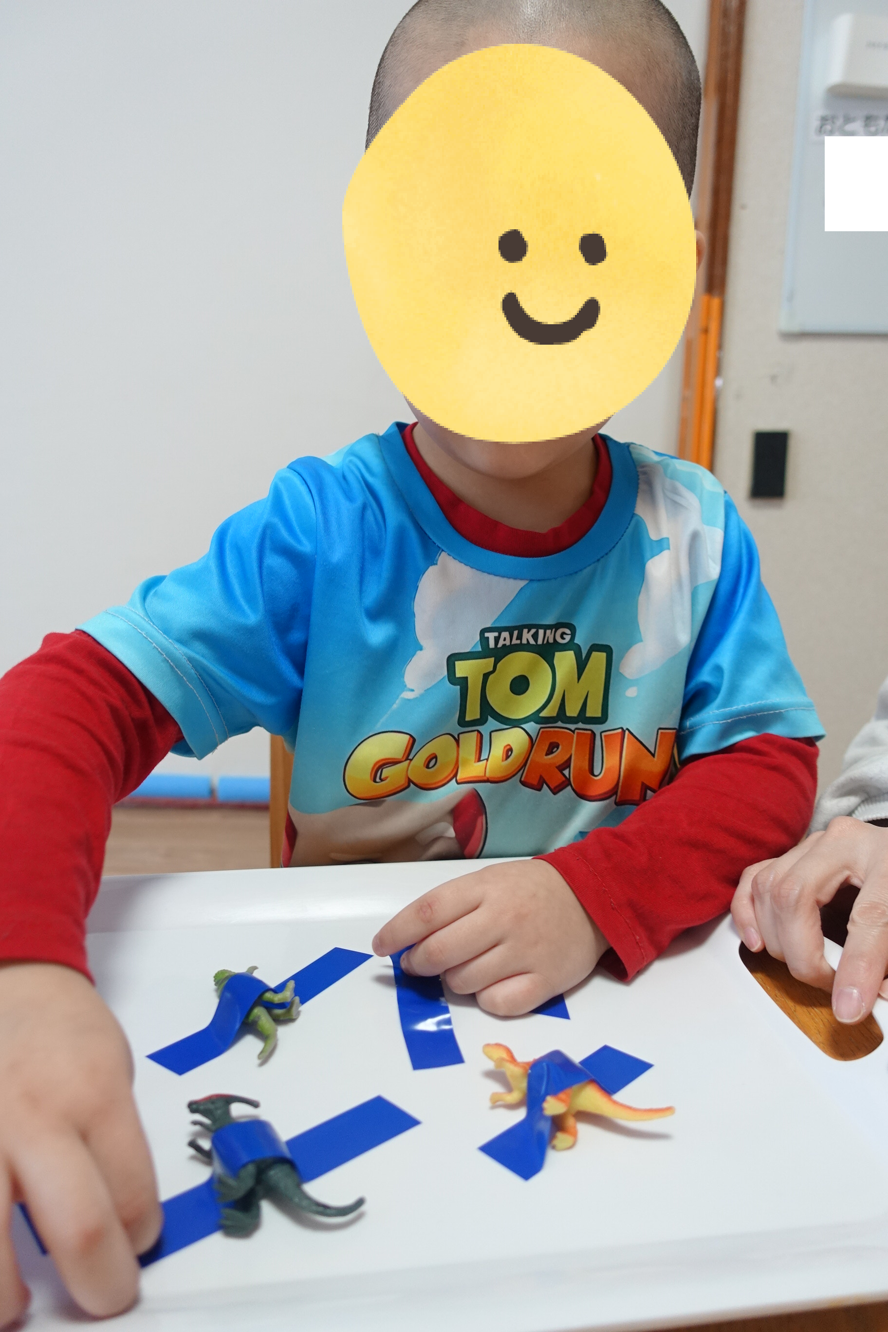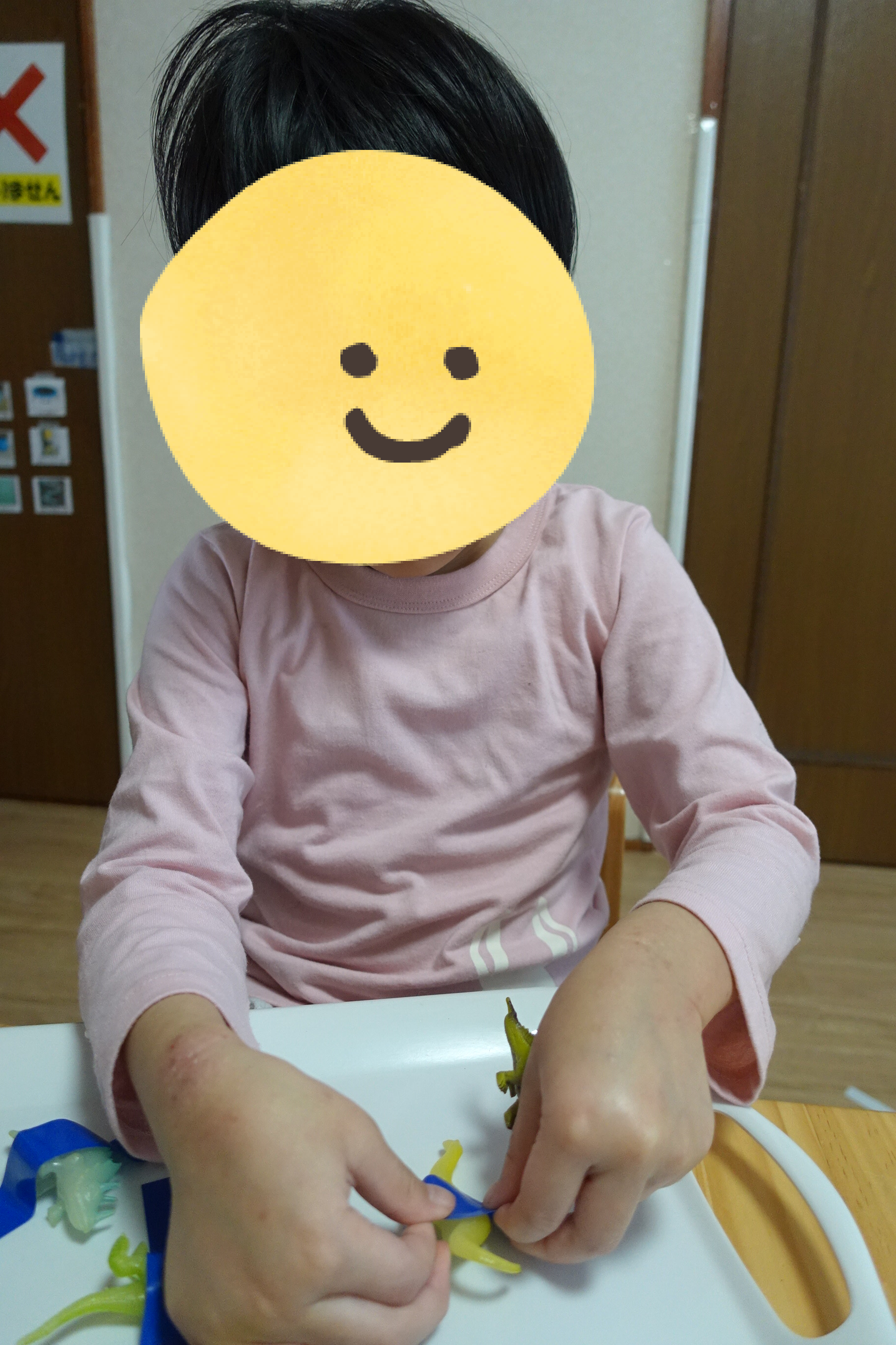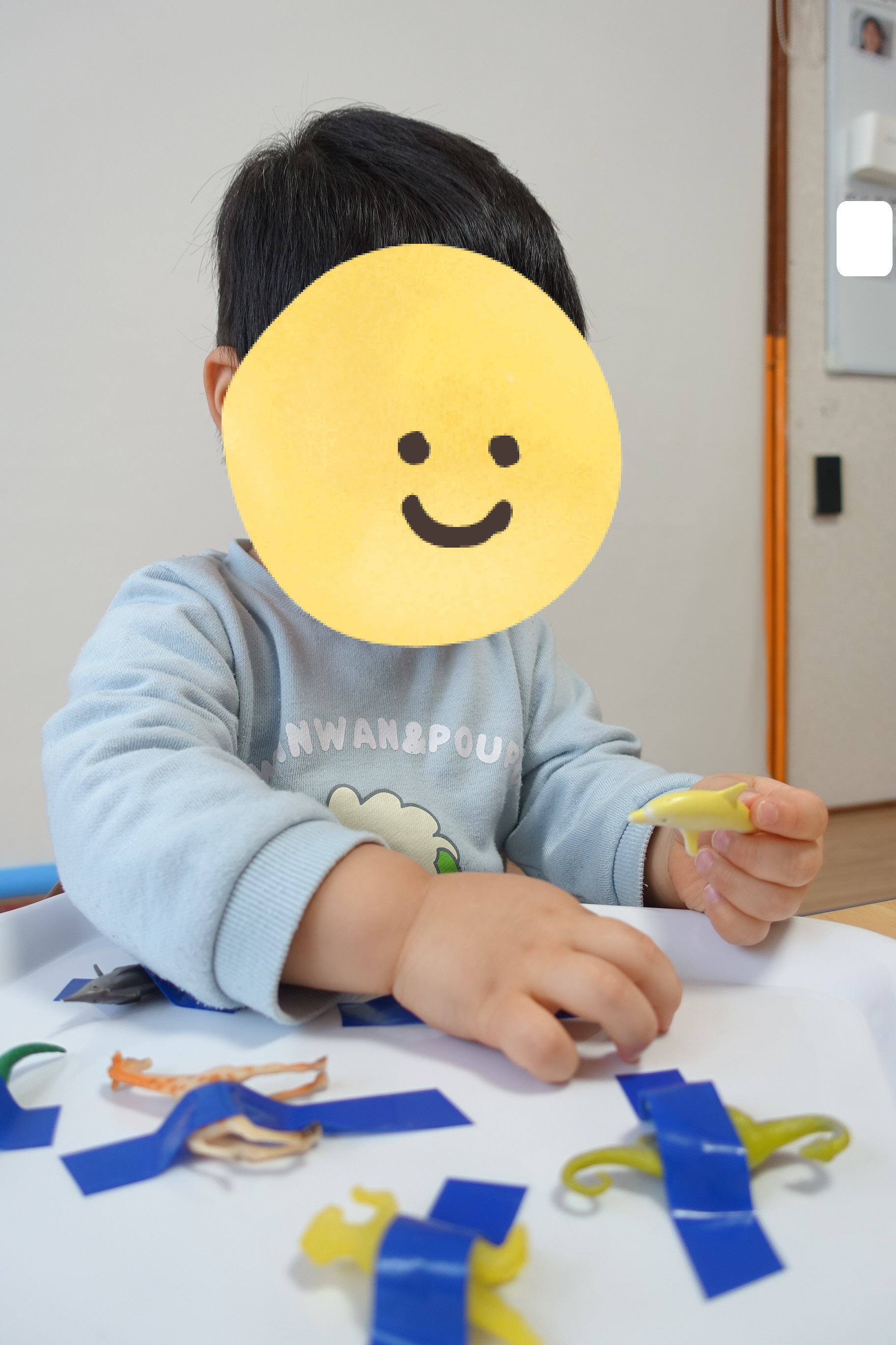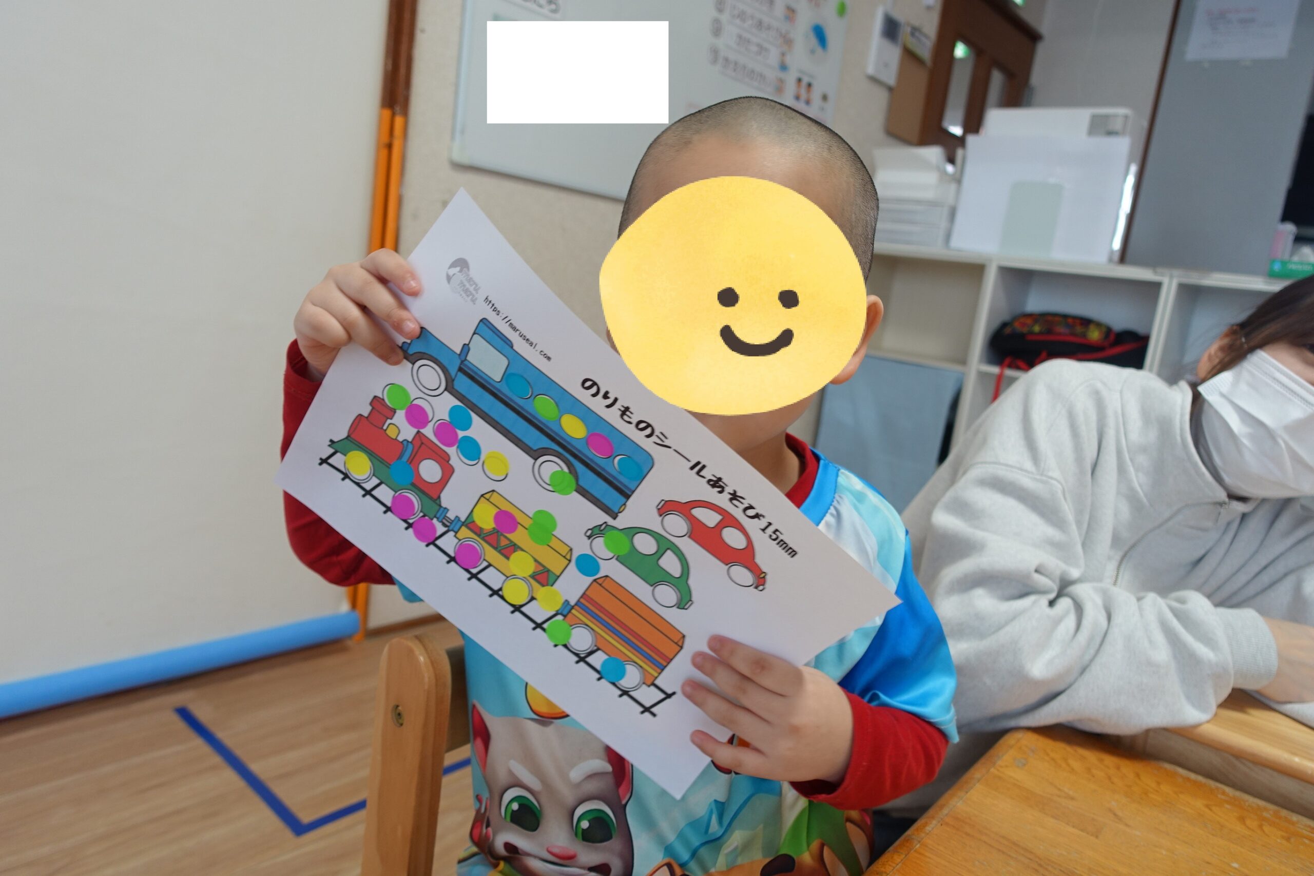 さらに今回は…シール貼りにも挑戦!✨台紙からシールをはがして、ペタッ!指先を上手に使いながら、好きな場所に貼ることができました✨