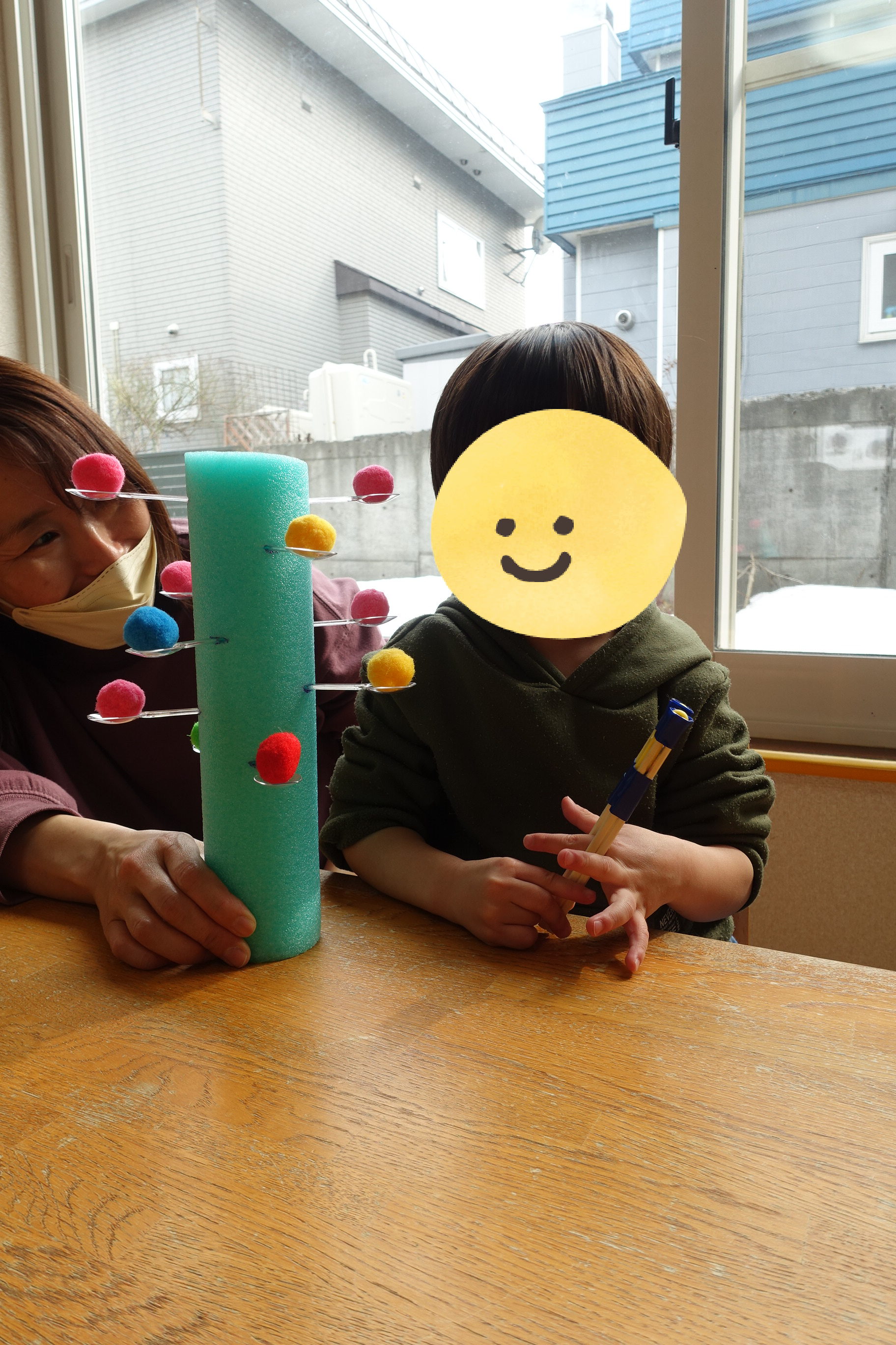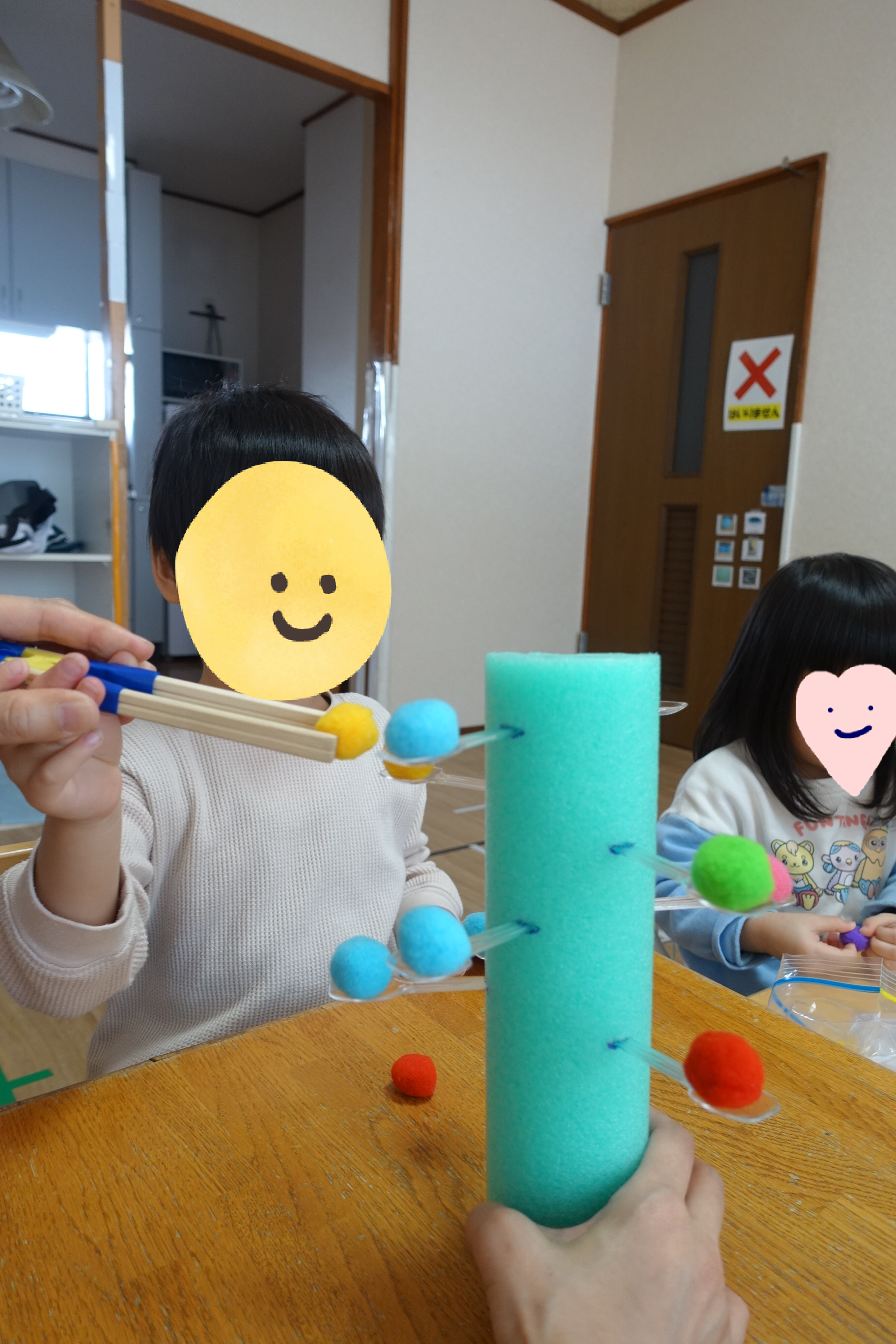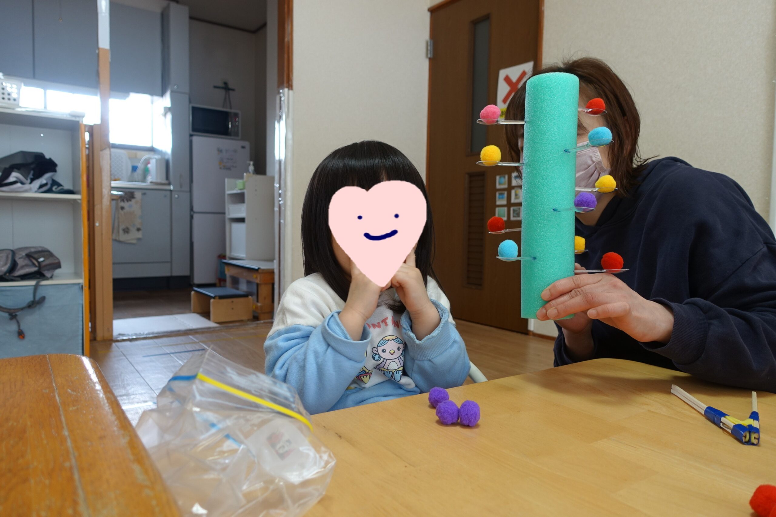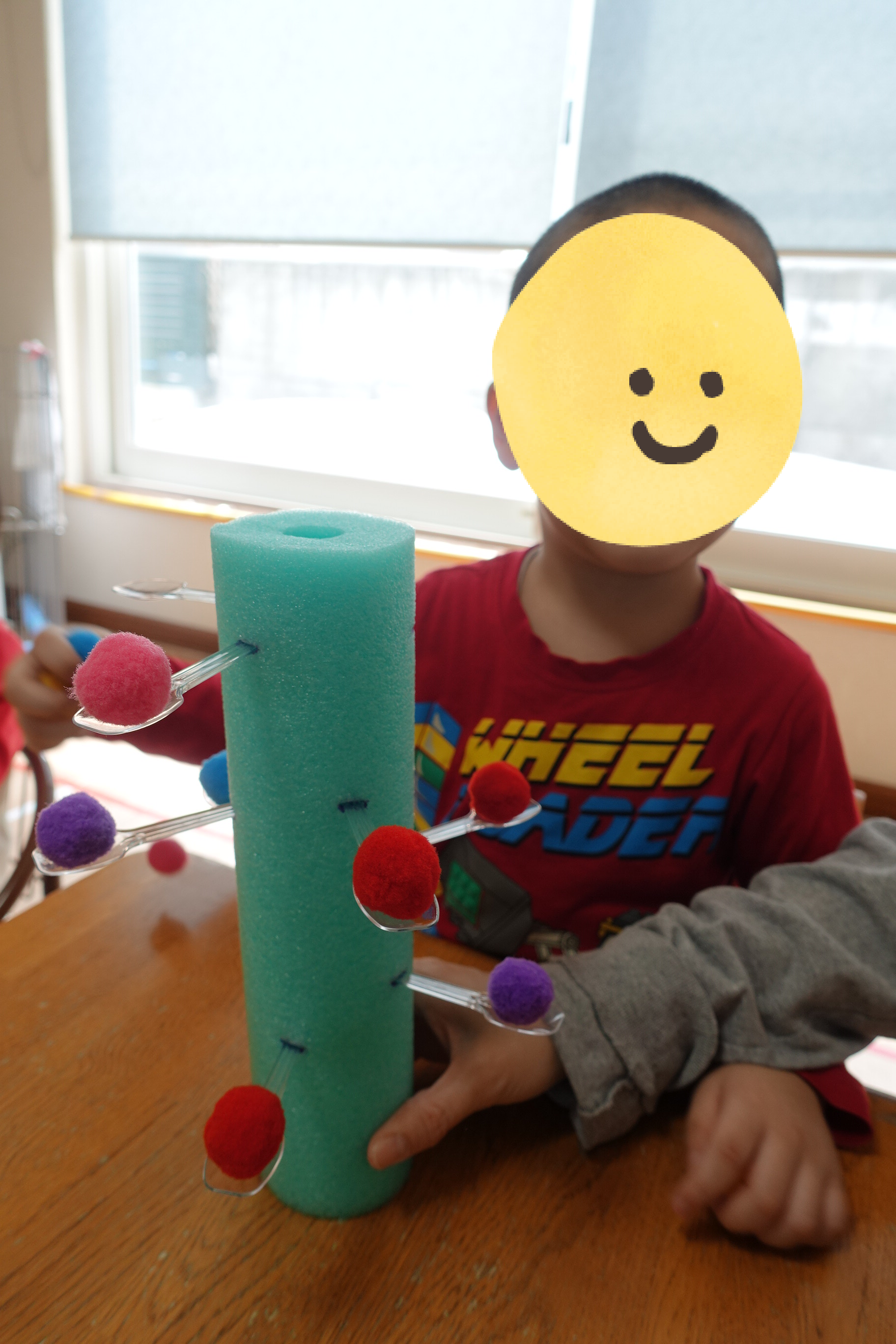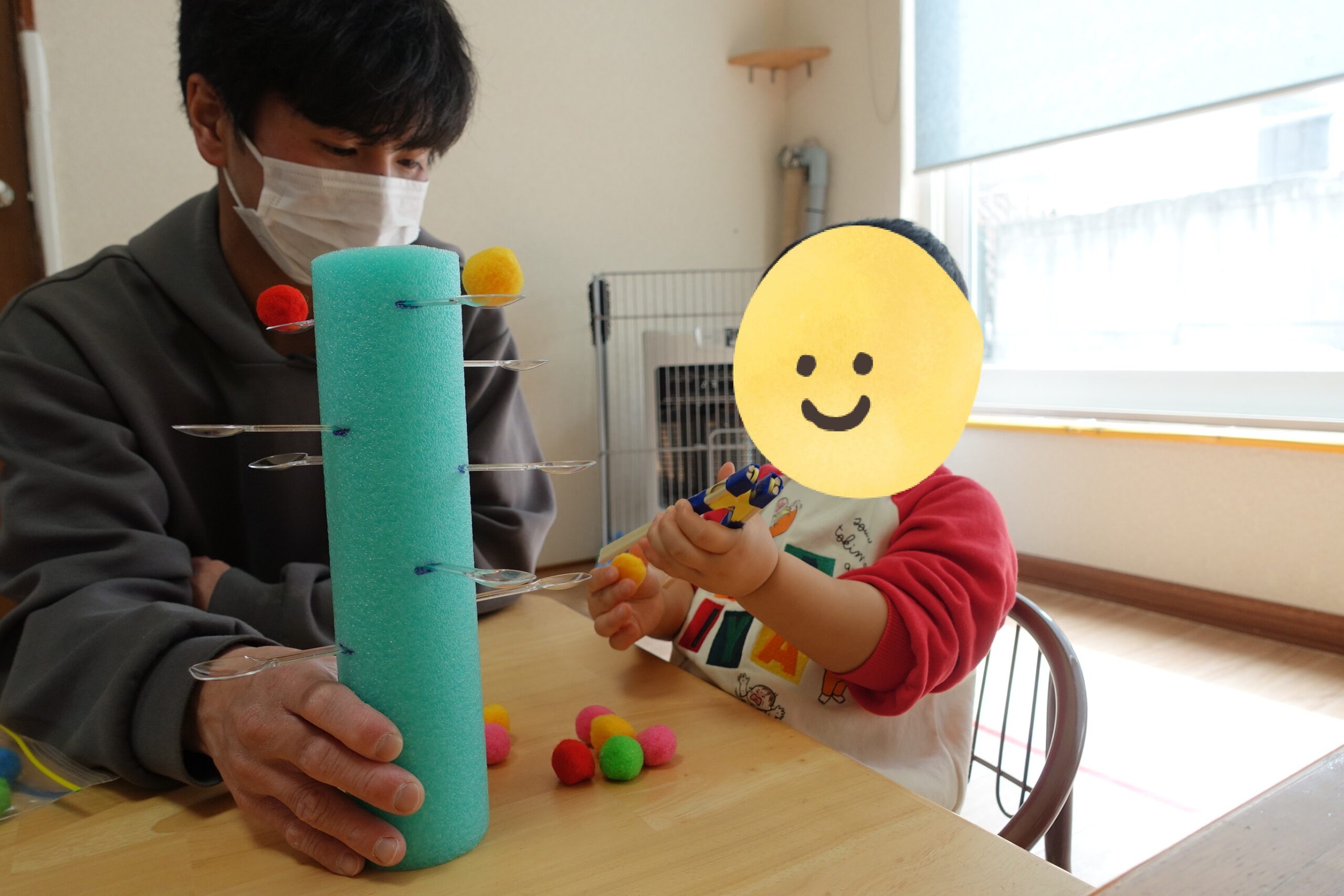 プールスティックの上にスプーンをのせて、その上に…ふわふわの ぽんぽんボール を手でそ〜っとのせます✨