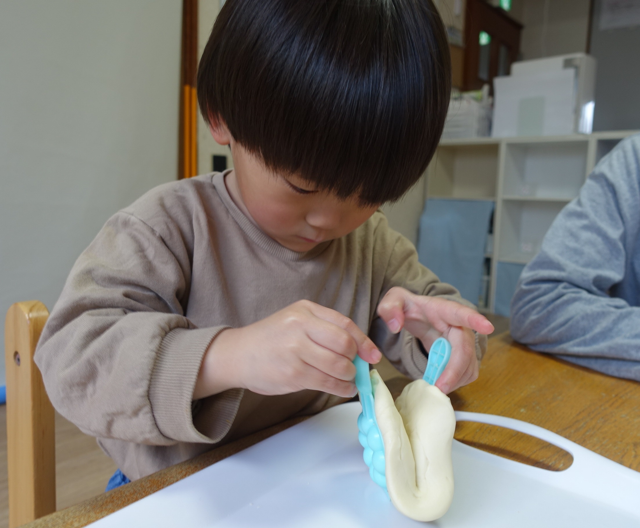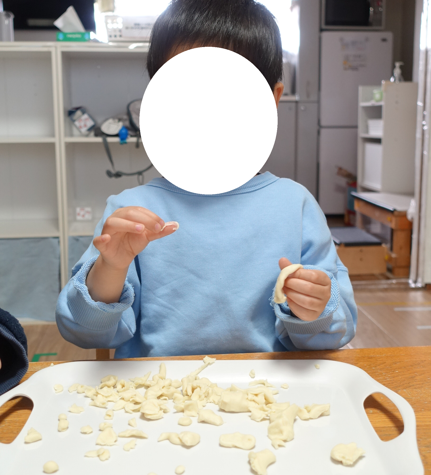 少しずつ感触が変わっていく様子を感じながら、「うどんみたい!」「こんな形もできたよ!」と、お友達との会話も弾んでいました🎵